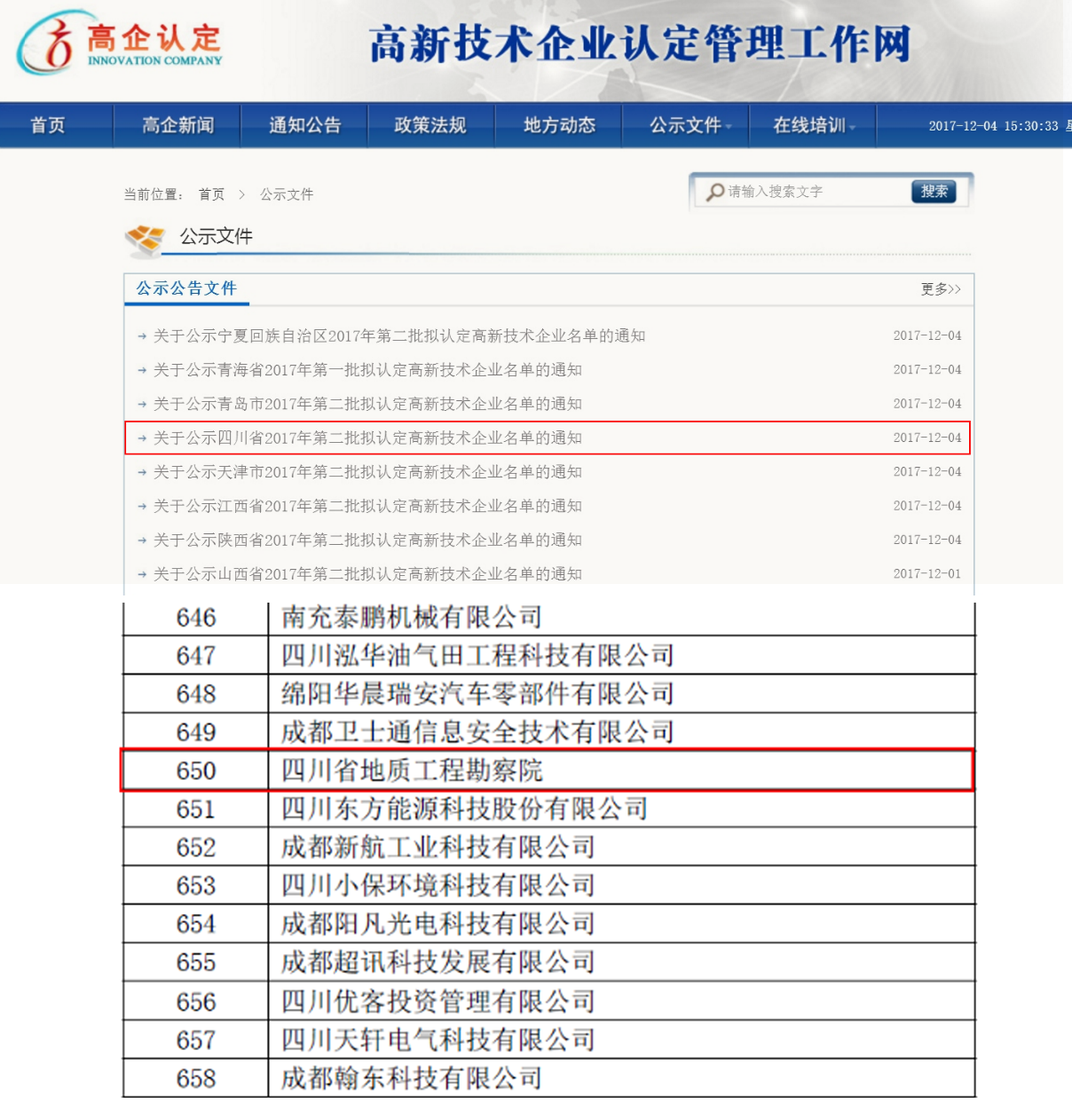 12月4日,國家高新技術(shù)企業(yè)認(rèn)定官網(wǎng)發(fā)布了“四川省2017年第二批擬認(rèn)定高新技術(shù)企業(yè)的公示名單”,四川地質(zhì)工程勘察院名列其中,榮膺高新技術(shù)企業(yè)認(rèn)定。