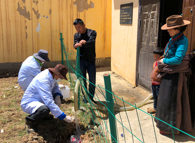 4月18日,項(xiàng)目組人員翻山越嶺,到達(dá)了位于海拔4300m的石渠縣城,開展石渠縣地下水監(jiān)測(cè)工作。換上白大褂,戴上口罩和乳膠手套,項(xiàng)目組人員對(duì)縣城周邊包蟲病防治地下水取水井進(jìn)行了全面的檢查和了解,做好相關(guān)調(diào)查記錄,并對(duì)典型井點(diǎn)進(jìn)行了采樣工作,為石渠縣包蟲病區(qū)廣大人民群眾安全飲水保駕護(hù)航。