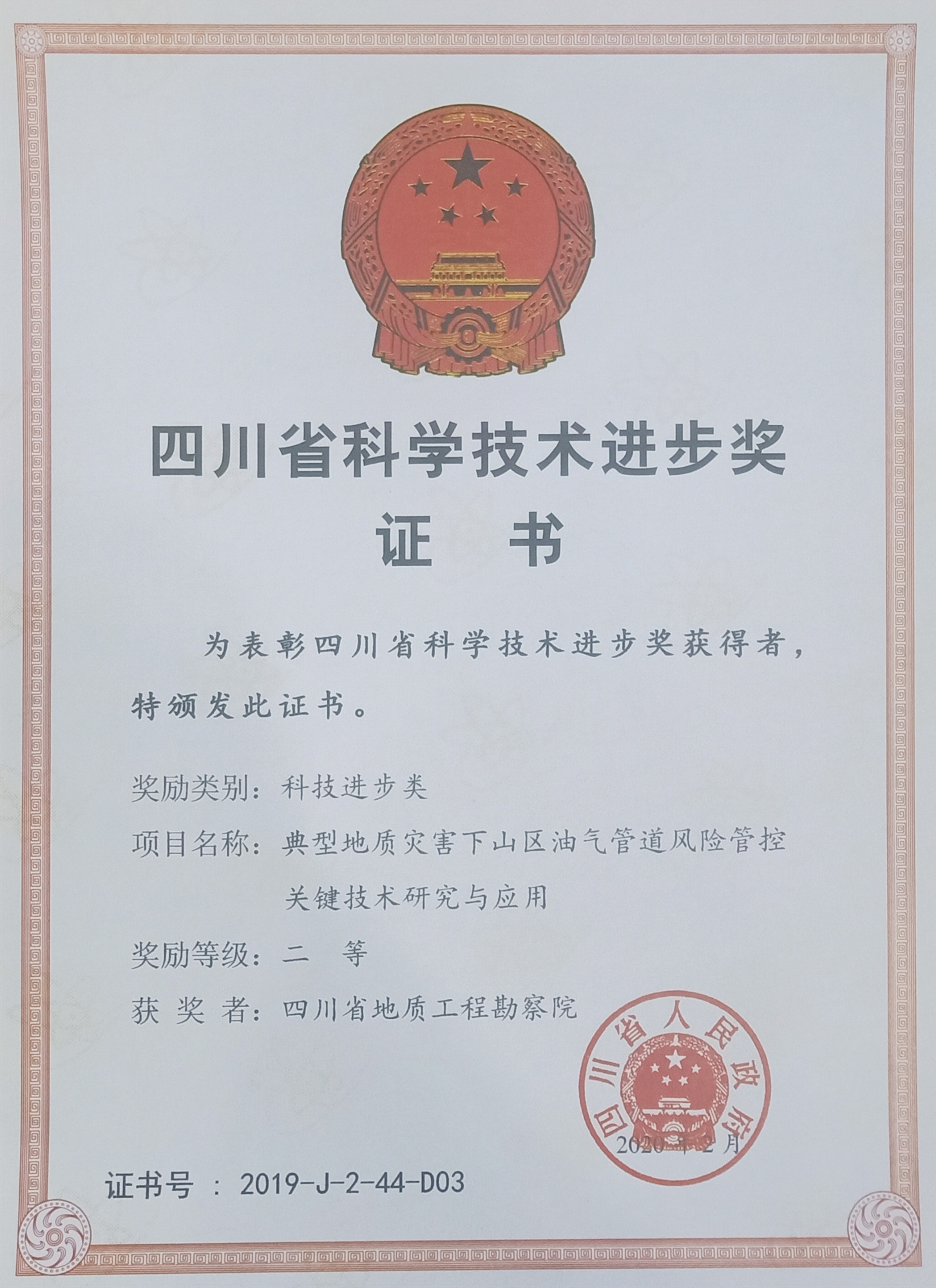 4月21日上午,四川省科學(xué)技術(shù)獎勵大會在成都舉行,大會公布了2019年度四川省科技進(jìn)步獎獲獎名單。其中,四川省地質(zhì)工程勘察院集團(tuán)有限公司《典型地質(zhì)災(zāi)害下山區(qū)油氣管道風(fēng)險管控關(guān)鍵技術(shù)研究與應(yīng)用》項目獲四川省科學(xué)技術(shù)進(jìn)步獎二等獎。